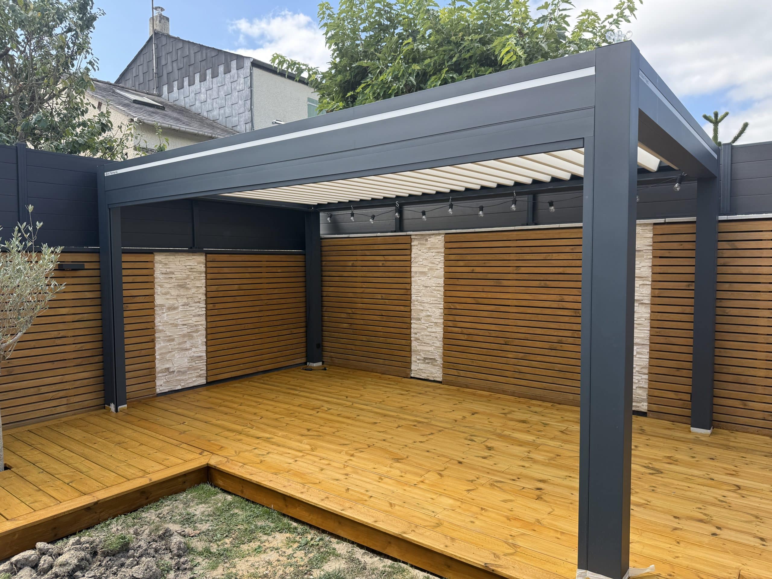 Le store de couleur GRIS CHARBON – RAL0130 vient protéger cette pergola bioclimatique du vent et du soleil .