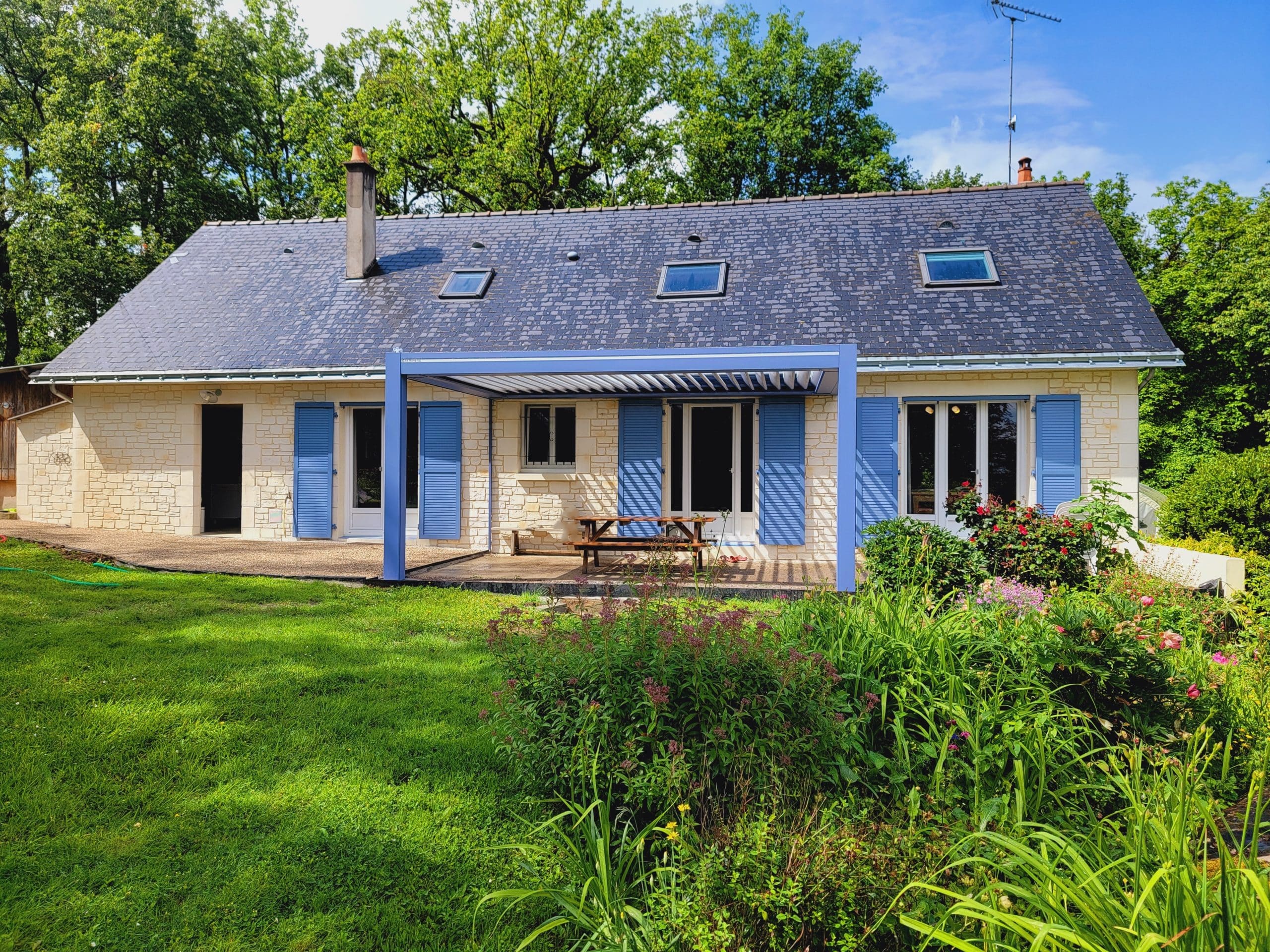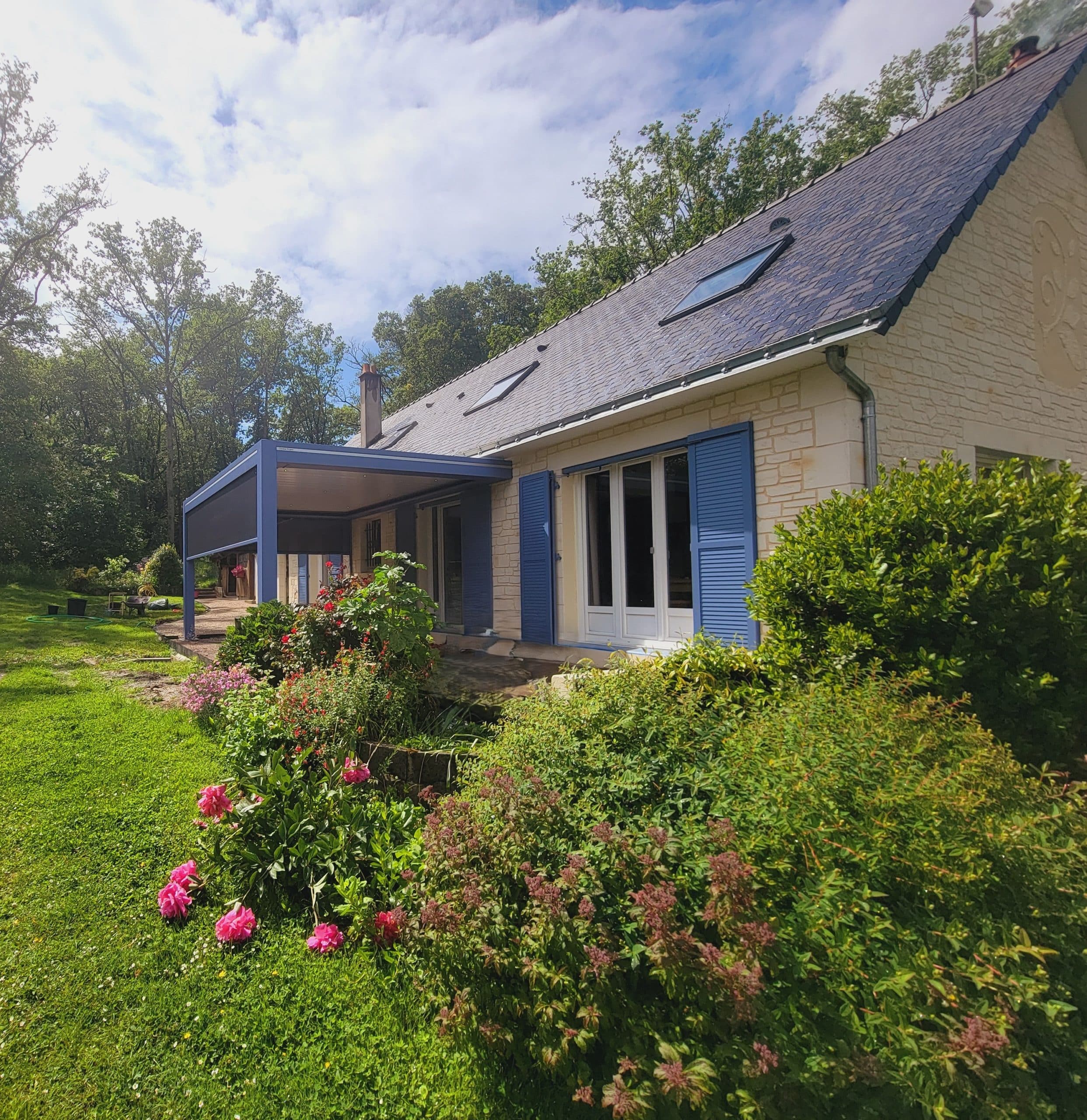 La pergola bioclimatique de Charcé Saint Ellier Lux Integral est implantée sur la terrasse existante avec vue sur le magnifique jardin.