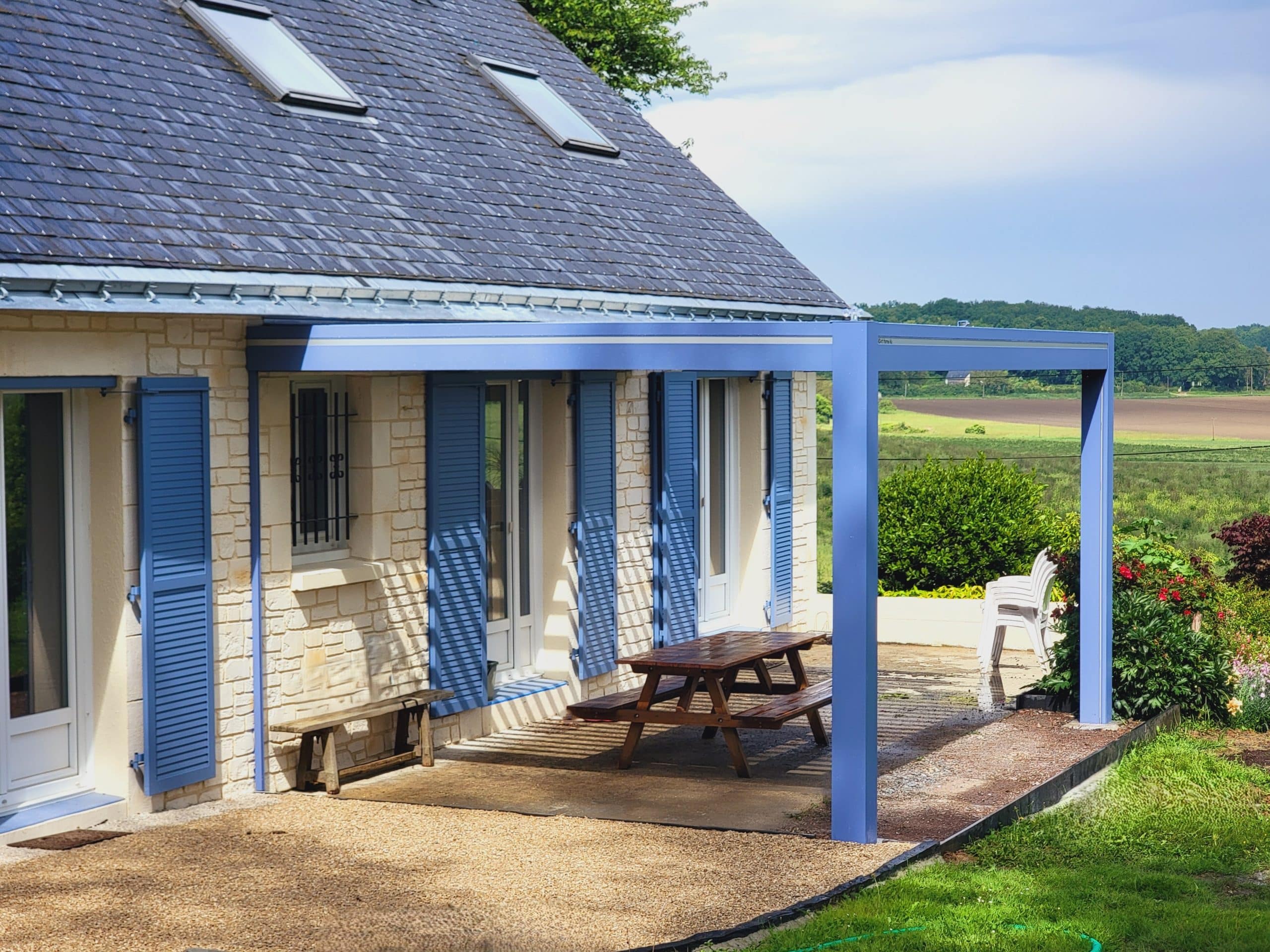 La couleur Bleu Provence – RAL 5014 FS de la structure de la pergola s’accorde parfaitement avec les huisseries et l’esprit longère de la maison.